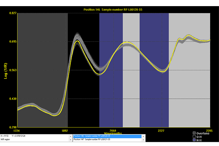 The NIR spectra shows how a single sample, represented by the yellow line, compares to the collection of historical sample data, represented by the gray line.